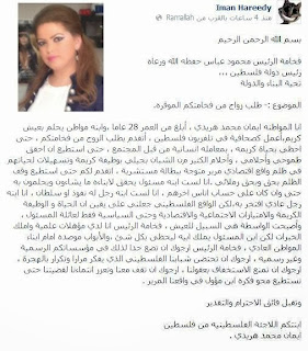 "أنا المواطنة ايمان محمد هريدي، أبلغ من العمر 28 عاما ،وابنه مواطن يحلم بعيش كريم،أعمل كصحافية في تلفزيون فلسطين، أتقدم بطلب الزوج من فخامتكم، حتى احظي بحياة كريمه ، بمعامله انسانية من قبل المجتمع، حتى استطيع ان احقق طموحي وأحلامي، وأحلام الكثير من الشبان من جيلي بوظيفة كريمة وتسهيلات لحياتهم في ظل واقع اقتصادي مرير متوجة ببطالة مستشرية".